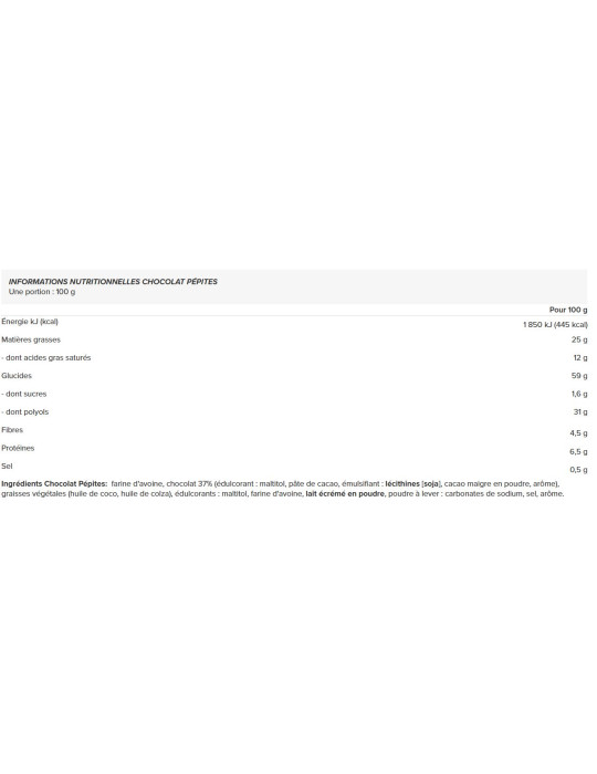 Ingredientes Nuggets de chocolate:Farinha de aveia, chocolate 37% (edulcorante: maltitol, massa de cacau, emulsionante: lecitinas [soja...], cacau em pó magro, aromatizante), gorduras vegetais (óleo de coco, óleo de colza), edulcorantes: maltitol, farinha de aveia, leite em pó desnatado, agente de fermentação: carbonato de sódio, sal, aromatizante.