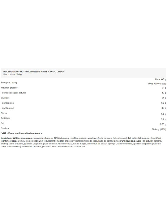 Ingredientes Creme de chocolate branco :Cobertura branca 27% (edulcorante: maltitol, gorduras vegetais (óleo de coco, óleo de colza), leite todo, leite desnatado, emulsionante : lecitinas [sojaAromatizante), creme de leite 25% (edulcorante: maltitol, gorduras vegetais (óleo de coco, óleo de colza), soro de leite em pó doce [de leiteFarinha de aveia, gorduras vegetais (óleo de coco, óleo de colza), cacau magro, 2% de pedaços de biscoito de esponja (farinha de trigo, gorduras vegetais (óleo de coco, óleo de colza), edulcorante: maltitol, levedante: bicarbonato de sódio, sal).
