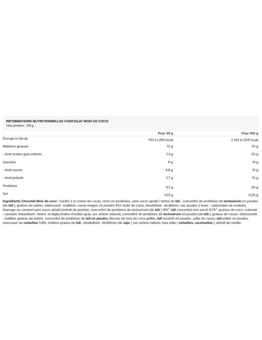 Ingredientes Chocolate de coco: Waffle de creme de cacau, rico em proteínas, sem adição de açúcar [ farinha de trigo, concentrado de proteínas de soro de leite [leite ] em pó, gordura de palma, edulcorante: maltitóis, cacau magro em pó 4%1, óleo de colza, emulsionante: lecitinas, sal, levedante: carbonatos de sódio], recheio de caramelo sem adição de açúcar [extrato de maçã, concentra d o de proteí nas de soro de leite [leite] em pó, gordura de palma, edulcorante: maltitóis, cacau magro em pó 4 , óleo de colza, emulsionante: lecitinas, sal, levedante: carbonatos de sódio]: lecitinas, sal, levedante: carbonatos de sódio], recheio de caramelo sem adição de açúcar [extrato de maçã, concentrado de proteínas de soro de leite 14%², leite condensado sem açúcar 8,7%², gordura de coco, corante: caramelo, emulsionante: mono e diglicéridos de ácidos gordos, sal, aroma natural], concentrado de proteínas de soro de leite em pó [leite ], gordura de cacau, edulcorantes : maltitol, gordura de palma, concentrado de proteína de leite em pó, flocos de coco torrado, leite em pó desnatado, massa de cacau, leite em pó gordo, pedaços de avelã 0,8%, gordura de leite, emulsionante: lecitina [soja ], sal, aroma natural, pasta de nozes (avelãs, amendoins ), extrato de baunilha.