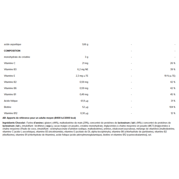 IngredientesChocolate:Farinha aveia ( glúten ) (44%), maltodextrina de milho (29%), concentrado proteico de soro de leite ( leite ) (14%) (concentrado de proteínas de soro de leite (leite), emulsionante: lecitinas (soja)), cacau em pó magro, creatina mono-hidratada, triglicéridos de cadeia média em pó (MCT) [triglycérides à chaîne moyenne d'huile de coco, émulsifiant : octénylsuccinate d'amidon sodique, maltodextrine], aromatizantes, edulcorante (sucralose), mistura de vitaminas [maltodextrine, vitamine C (acide L-ascorbique), vitamine B3 (nicotinamide), vitamine E (acétate de DL-alpha-tocophéryle), vitamine B6 (chlorhydrate de pyridoxine), vitamine B2 (riboflavine), vitamine B1 (chlorhydrate de thiamine), acide folique (acide ptéroylmonoglutamique), biotine et vitamine B12 (cyanocobalamine)], sal.