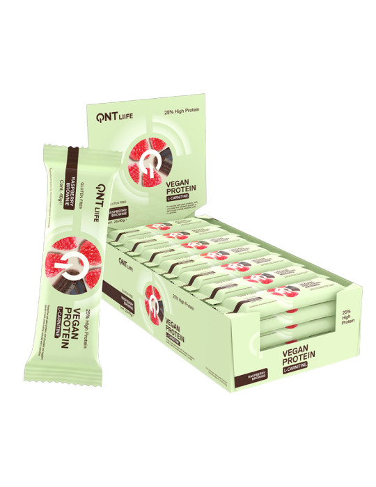 Barra de proteína vegana 25% l-carnitina (28x40g) é uma caixa de barras de proteína contendo L-Carnitina, fabricada pela marca QNT.
