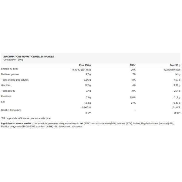 Ingredientes - sabor a baunilha : concentrado proteico de soro de leite nativo não instantâneo (WPC) (94%), aromas (5,7%), inulina, B-galactosidase (lactase) (<1%), Bacillus coagulans GBI-30 6086 (contém leite) <1%, edulcorante: sucralose.