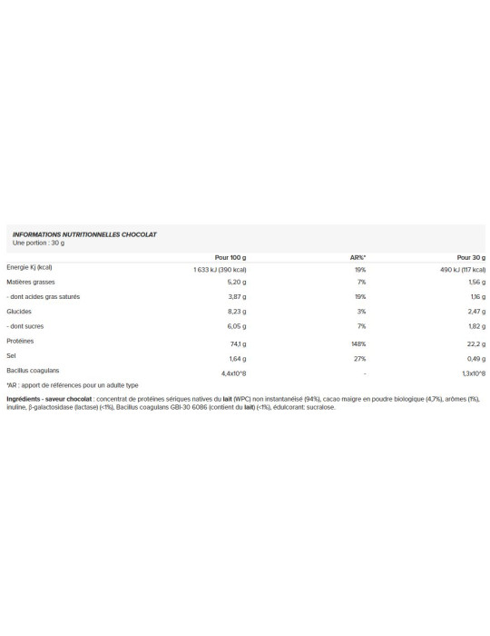 Ingredientes - sabor a chocolate : concentrado proteico de soro de leite nativo não instantâneo (WPC) (94%), cacau em pó biológico magro (4,7%), aromas (1%), inulina, β-galactosidase (lactase) (<1%), Bacillus coagulans GBI-30 6086 (contém leite) (<1%), edulcorante: sucralose.