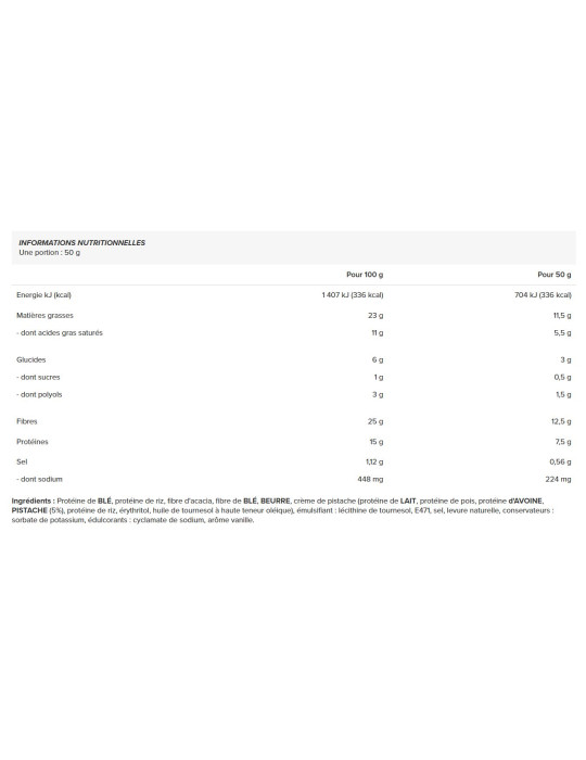 Ingredientes : Proteína de TRIGO, proteína de arroz, fibra de acácia, fibra de TRIGO, MANTEIGA, creme de pistáchio (proteína de LEITE, proteína de ervilha, proteína de AVEIA, PISTACHE (5%), proteína de arroz, eritritol, óleo de girassol de alto teor oleico), emulsionante: lecitina de girassol, E471, sal, fermento natural, conservantes: sorbato de potássio, edulcorantes: ciclamato de sódio, aroma de baunilha.