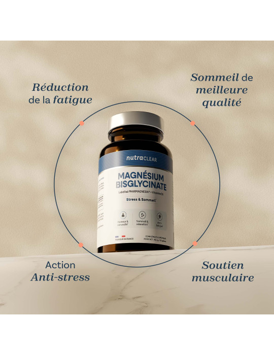 O bisglicinato de magnésio com o rótulo Pharmagnesia® da marca francesa Nutraclear oferece uma biodisponibilidade elevada e uma excelente tolerância digestiva. Sem aditivos inúteis, garante uma pureza excecional para um efeito ótimo na sua saúde.