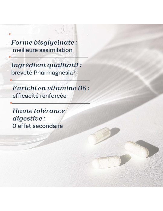 O bisglicinato de magnésio é uma das formas mais bem absorvidas, sendo a sua assimilação reforçada pela vitamina B6. Ao contrário de outras formas (óxido, marinho...), é suave para o estômago e garante uma eficácia óptima sem desconforto digestivo.