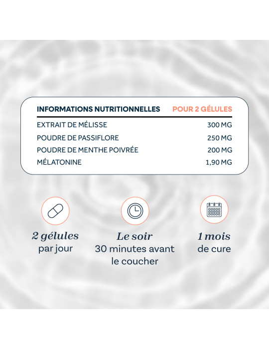 Ingredientes: extrato seco de folha de erva-cidreira(Melissa officinalis), pó de partes aéreas depassiflora (Passiflora incarnata), pó de folha de hortelã-pimenta(Mentha piperita), agente de revestimento: hidroxipropilmetilcelulose, pó de fibra de maçã biológica.