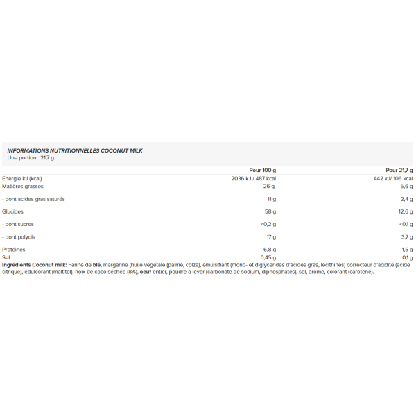 Ingredientes Leite de coco :Farinha trigo, margarina (óleo vegetal (palma, colza), emulsionante (mono e diglicéridos de ácidos gordos, lecitinas), regulador de acidez (ácido cítrico), edulcorante (maltitol), coco seco (8%), ovo farinha integral, levedante (carbonato de sódio, difosfatos), sal, aromatizante, corante (caroteno).
