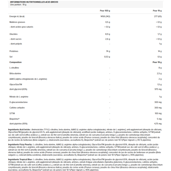 Ingredientes Tijolos ácidos: aminoácidos 71 % [L-citrulina, beta-alanina, AAKG (L-arginine alpha-cetoglutarate), nitrate de L-arginine], agente antiaglomerante (dióxido de silício), GlycerSizeTM [(poudre de glycérol 65 %, anti-agglomérant (dioxyde de silicium)], agente acidificante (ácido málico), aromas, D-glucuronolactona, cafeína anidra, S7TM [extrait sec de café vert (Coffea arabica L.), extrait sec de thé vert (Camellia sinensis), extrait sec de curcuma (Curcuma longa L.), poudre de canneberge (Vaccinium corymbosum), poudre de brocoli (Brassica oleracea italica), poudre de cerise acide (Prunus cerasus), poudre de chou frisé (Brassica oleracea acephala)], concentrado de sumo de beterraba (Beta vulgaris L.), edulcorantes (sucralose, acessulfame K), Bioperine® (extrato seco de pimenta preta 10:1 (Piper nigrum L.) 95% piperina).
