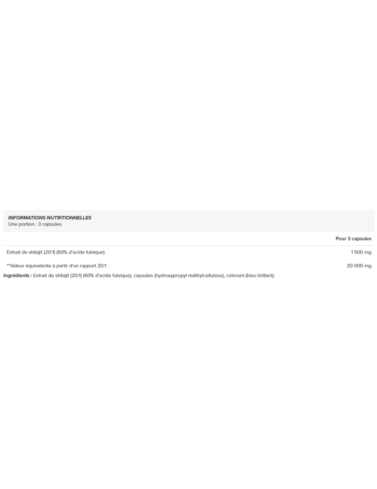 Ingredientes: extrato de shilajit (20:1) (60% ácido fúlvico), cápsulas (hidroxipropilmetilcelulose), corante (azul brilhante).