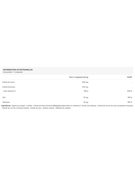 Ingredientes : Agente de volume: sorbitol - Extrato de bagas de acerola (Malpighia glabra) titulado em vitamina C (ácido ascórbico) - Extrato de raiz de maca (Lepidium meyenii) - Extrato de farelo de arroz (Oryza sativa) - Citrato de zinco - Aroma natural - Selenito de sódio.
