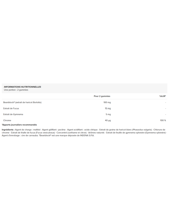 Ingredientes : Agente de volume: maltitol - Agente gelificante: pectina - Agente acidificante: ácido cítrico - Extrato de sementes de feijão branco (Phaseolus vulgaris) - Cloreto de crómio - Extrato de talo de algas (Fucus vesiculosus) - Concentrado (cártamo e limão) - Aromas naturais - Extrato de folhas de Gymnema sylvestre (Gymnema sylvestre) - Agente de revestimento: cera de carnaúba. *Beanblock® é uma marca registada da INDENA S.P.A.