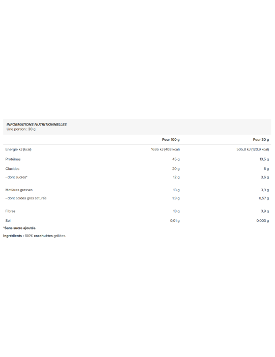 Mas isso não é tudo. Com 13,5 g de proteínas por porção (ou seja, 45 g por 100 g), esta manteiga de amendoim reforça a sua recuperação muscular e a sua sensação de saciedade. É também naturalmente rica em fibras alimentares, pelo que é mais fácil de digerir e ajuda a refrear os desejos.
