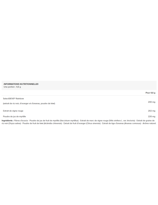 Ingredientes : Fibra de acácia - Sumo de mirtilo em pó (Vaccinium myrtillus) - Extrato de bagaço de videira vermelha (Vitis vinifera L. var. tinctoria) - Extrato de sementes de arroz preto (Oryza sativa) - Pó de kiwi (Actinidia chinensis) - Extrato de laranja (Citrus sinensis) - Extrato de caule de ananás (Ananas comosus) - Aroma natural.