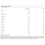 Ingredientes: Invólucro da cápsula : hipromelose, corante (complexo de cobre-clorofila e clorofilina) - Óxido de magnésio - Extrato de raiz de Rhodiola (Rhodiola rosea) - Fibra de acácia - Ácido ascórbico (vitamina C) - Lactato de ferro - Spirulina em pó (Spirulina platensis) - Levedura enriquecida com selénio - Nicotinamida (vitamina B3) - Citrato de zinco - D-pantotenato de cálcio (vitamina B5) - Colecálcio (vitamina B6) - Colesterol (vitamina B6) Citrato de zinco - D-pantotenato de cálcio (vitamina B5) - Colecalciferol (vitamina D3) extraído de líquenes - Cianocobalamina (vitamina B12) - Cloridrato de piridoxina (vitamina B6) - Cloridrato de tiamina (vitamina B1) - Riboflavina (vitamina B2) - Ácido pteroilmonoglutâmico (vitamina B9).