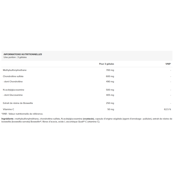 Ingredientes: metilsulfonilmetano, sulfato de condroitina, N-acetilglucosamina(crustáceos), cápsula de origem vegetal (agente de revestimento: pululano), extrato de resina de boswellia (boswellia serrata) Boswellin®, fibra de acácia, ácido L-ascórbico Quali®-C (vitamina C).