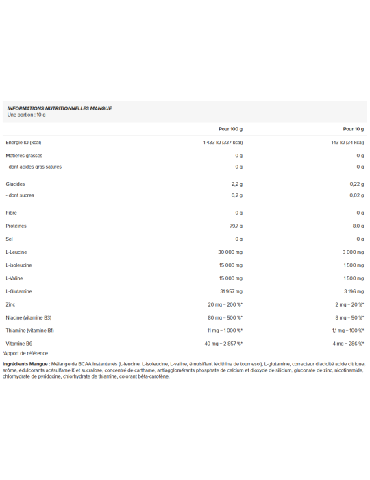 Ingredientes Manga : mistura instantânea de BCAA (L-leucina, L-isoleucina, L-valina, emulsionante lecitina de girassol), L-glutamina, regulador de acidez ácido cítrico, aroma, edulcorantes acessulfame K e sucralose, concentrado de cártamo, agentes antiaglomerantes fosfato de cálcio e dióxido de silício, gluconato de zinco, nicotinamida, cloridrato de piridoxina, cloridrato de tiamina, corante beta-caroteno.