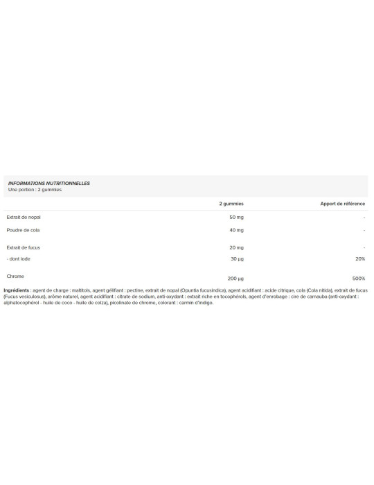 Ingredientes: Agente de volume: maltitóis, gelificante: pectina, extrato de nopal (Opuntia fucusindica), acidificante: ácido cítrico, cola (Cola nitida), extrato de algas (Fucus vesiculosus), aroma natural, acidificante: citrato de sódio, antioxidante: extrato rico em tocoferóis, agente de revestimento: cera de carnaúba (antioxidante: alfatocoferol - óleo de coco - óleo de colza), picolinato de crómio, corante: índigo carmim.