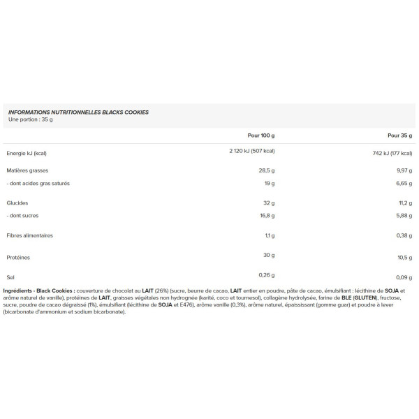 Ingredientes - Bolachas pretas: Cobertura de chocolate de LEITE (26%) (açúcar, manteiga de cacau, leite gordo em pó, massa de cacau, emulsionante : lecitina de SOJA e aroma natural de baunilha), proteína de LEITE, gorduras vegetais não hidrogenadas (karité, coco e girassol), colagénio hidrolisado, farinha de TRIGO(GLÚTEN), frutose, açúcar, cacau em pó desengordurado (1%), emulsionante ( lecitina SOJA e E476), aroma de baunilha (0,3%), aroma natural, espessante (goma de guar) e levedante (bicarbonato de amónio e bicarbonato de sódio).