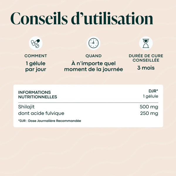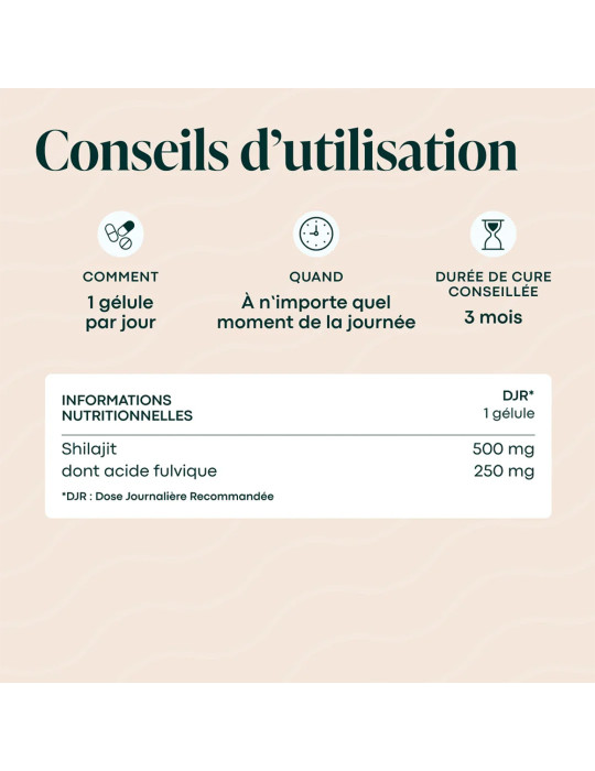 Fabricado em França, vegan, sem aditivos controversos nem OGM, o Shilajit de Novoma é apresentado em cápsulas vegetais para uma utilização fácil, prática e bem tolerada.