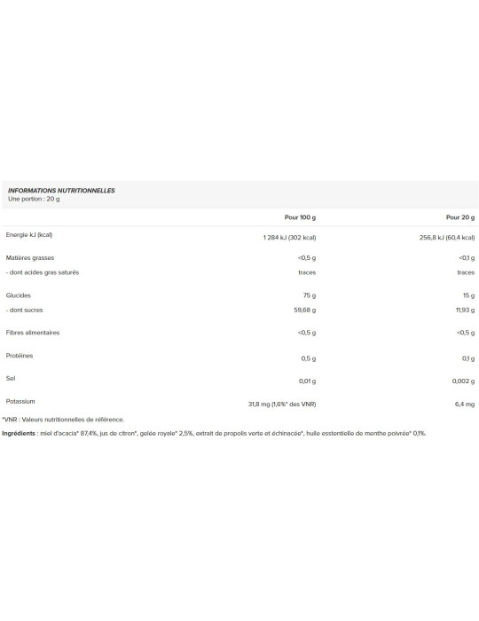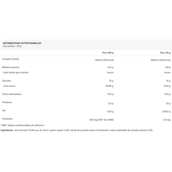 Ingredientes: mel de acácia* 87,4%, sumo de limão*, geleia real* 2,5%, extrato de própolis verde e equinácea*, óleo essencial de hortelã-pimenta* 0,1%.