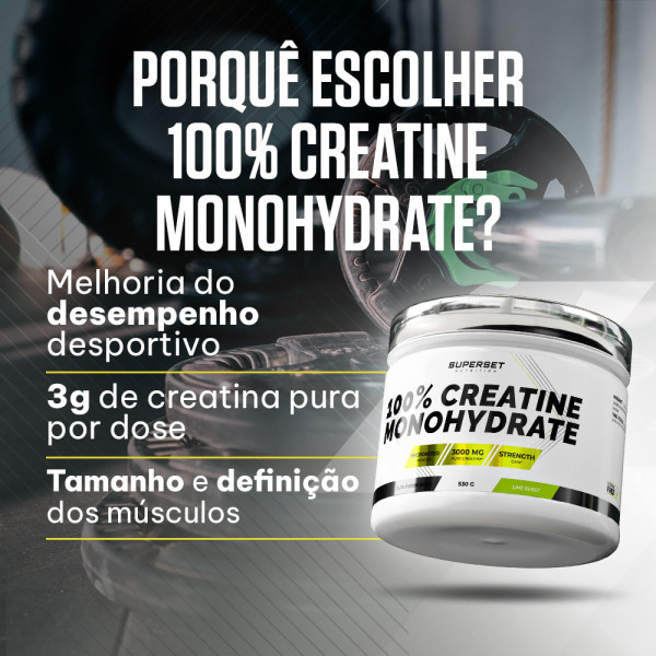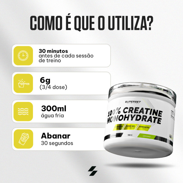 Desenvolvido pelos especialistas em nutrição e treinadores desportivos da marca Superset Nutrition, 100% Creatine Monohydrate (530g) combina creatina monohidratada micronizada, elevada pureza e um refrescante sabor a lima.