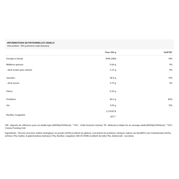 Ingredientes - Sabor a baunilha: aveia integral biológica em pó (50%) (contém glúten), concentrado proteico de soro de leite nativo não instantâneo (WPC) (42%), aromas (7%), inulina, β-galactosidase (lactase) (<1%), Bacillus coagulans GBI-30 6086 (contém leite) (<1%), edulcorante: sucralose