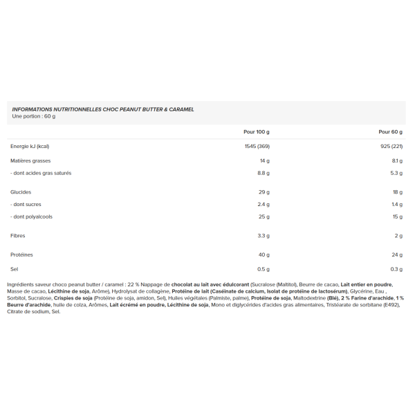 Ingredientes - Choc Manteiga de Amendoim & Sabor a Caramelo : cobertura de chocolate de leite a 22% com edulcorante (sucralose (maltitol), manteiga de cacau, leite gordo em pó, massa de cacau, lecitina de soja, aromatizante), hidrolisado de colagénio, proteína de leite (caseinato de cálcio, isolado de proteína de soro de leite), glicerina, água, sorbitol, sucralose, crocantes de soja (proteína de soja, amido, sal), óleos vegetais (palmiste, palma), proteína de soja, maltodextrina (trigo), 2% de farinha de amendoim, 1% de manteiga de amendoim, óleo de colza, aromas, leite em pó desnatado, lecitina de soja, mono e diglicéridos de ácidos gordos alimentares, triestearato de sorbitano (e492), citrato de sódio, sal.