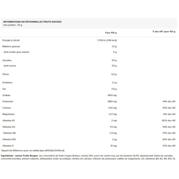 Ingredientes - Sabor a frutos vermelhos: sumo concentrado de frutos vermelhos (morango, groselha) 35%, açúcar mascavado de cana, sumo de maçã 10,5%, espessante: farinha de alfarroba, concentrado (cenoura), aromas naturais, antioxidante: ácido ascórbico, citrato de cálcio, cloreto de potássio, sulfato de magnésio, sal, vitaminas (B1, B2, B6, B12, E).