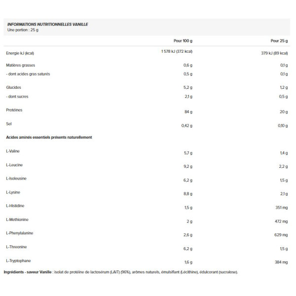 Ingredientes - Sabor a baunilha : proteína isolada de soro de leite(LEITE) (96%), aromas naturais, emulsionante (lecitina), edulcorante (sucralose).