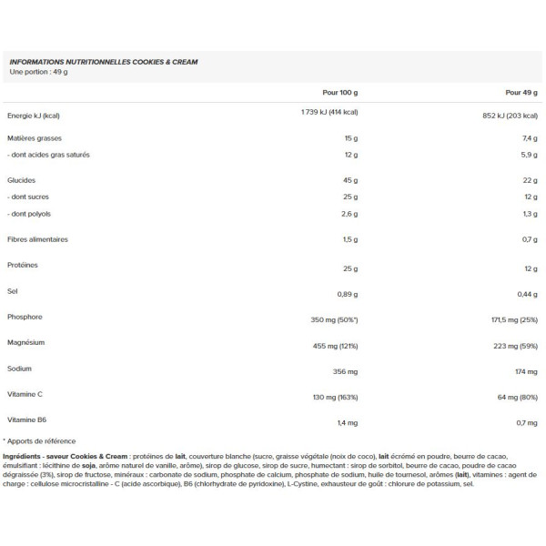 Ingredientes - Sabor a Cookies & Cream: proteína de leite, cobertura branca (açúcar, gordura vegetal (coco), leite desnatado em pó, manteiga de cacau, emulsionante: lecitina de soja, aroma natural de baunilha, aromatizante), xarope de glucose, xarope de açúcar, humectante : xarope de sorbitol, manteiga de cacau, cacau em pó desengordurado (3%), xarope de frutose, minerais: carbonato de sódio, fosfato de cálcio, fosfato de sódio, óleo de girassol, aromas(leite), vitaminas: agente de volume: celulose microcristalina - C (ácido ascórbico), B6 (cloridrato de piridoxina), L-cistina, intensificador de sabor: cloreto de potássio, sal.