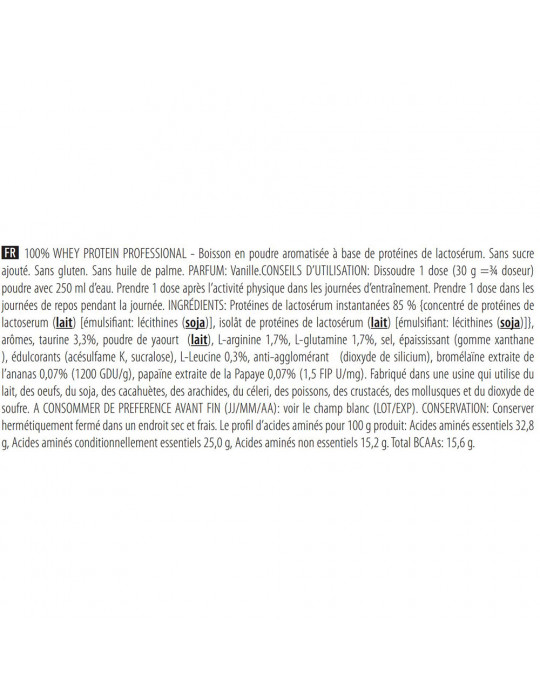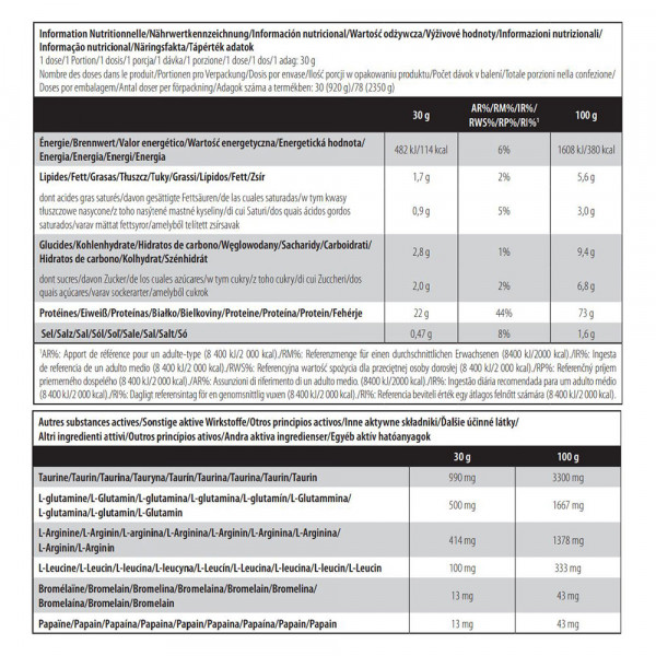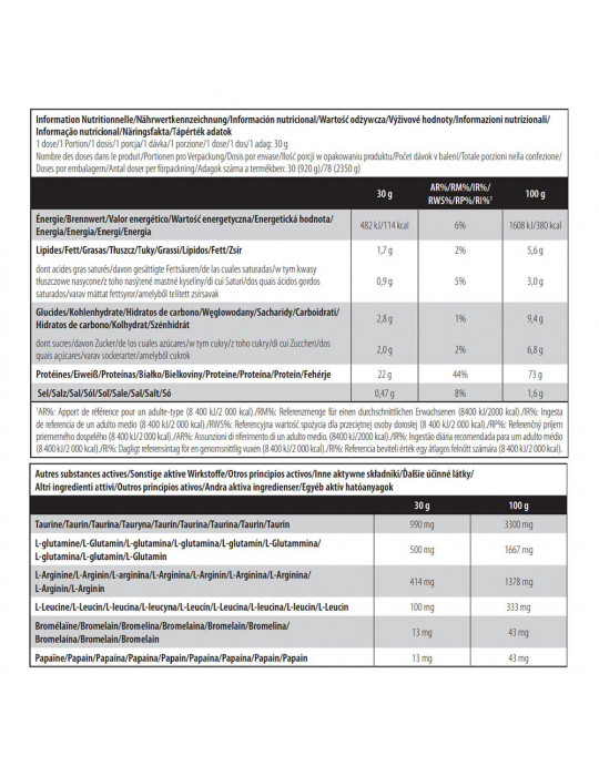 Baunilha: 85% de proteína de soro de leite instantânea {concentrado de proteína de soro de leite(leite) [emulsionante: lecitinas(soja)], isolado de proteína de soro de leite(leite) [emulsionante: lecitinas(soja)]}, aromas, taurina 3,3%, iogurte em pó(leite), L-arginina 1,7%, L-glutamina 1,7%, sal, espessante (goma xantana), edulcorantes (acessulfame K, sucralose), L-Leucina 0,3%, antiaglomerante (dióxido de silício), bromelaína extraída do ananás 0,07% (1200 GDU/g), papaína extraída da papaia 0,07% (1,5 FIP U/mg).