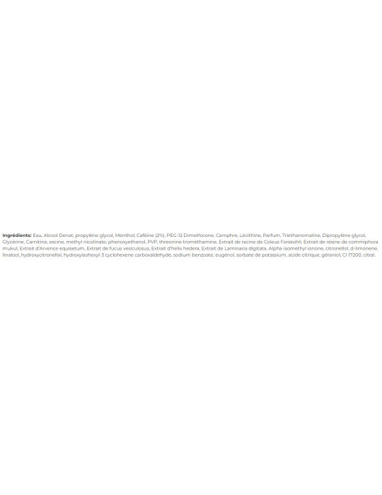 Ingredientes: Água, álcool Denat, propilenoglicol, mentol, cafeína (2%), PEG-12 dimeticona, cânfora, lecitina, perfume, trietanomalina, dipropilenoglicol, glicerina, carnitina, escina, nicolinato de metilo, fenoxietanol, PVP, treonina trometamina, extrato de raiz de Coleus Forskohli, extrato de resina de Commiphora mukul, Extrato de Arvence equisetum, extrato de Fucus vesiculosus, extrato de Helix hedera, extrato de Laminaria digitata, ionona alfa-isometil, citronelol, d-limoneno, linalol, hidroxicitronelal, hidroxiisohexil-3 ciclohexeno carboxaldeído, benzoato de sódio, eugenol, sorbato de potássio, ácido cítrico, geraniol, CI 17200, citral.